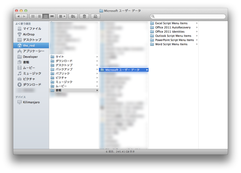 「Office 2011 Identities」の中にメールデータが入ってるみたいなので、Outlook使ってる時はこれを退避しておきましょう。ただ、設定完了後に「Office 2011 Identities」だけごっそり戻すと元の設定とごっちゃになっておかしくなるかもしれないので、受信メールはOutlookの機能で書き出し、アカウント情報はメモを取っておくなどした方がいいとのこと。俺はOutlook使ってないので詳しくは分かりません。やる人は慎重にお願いします。